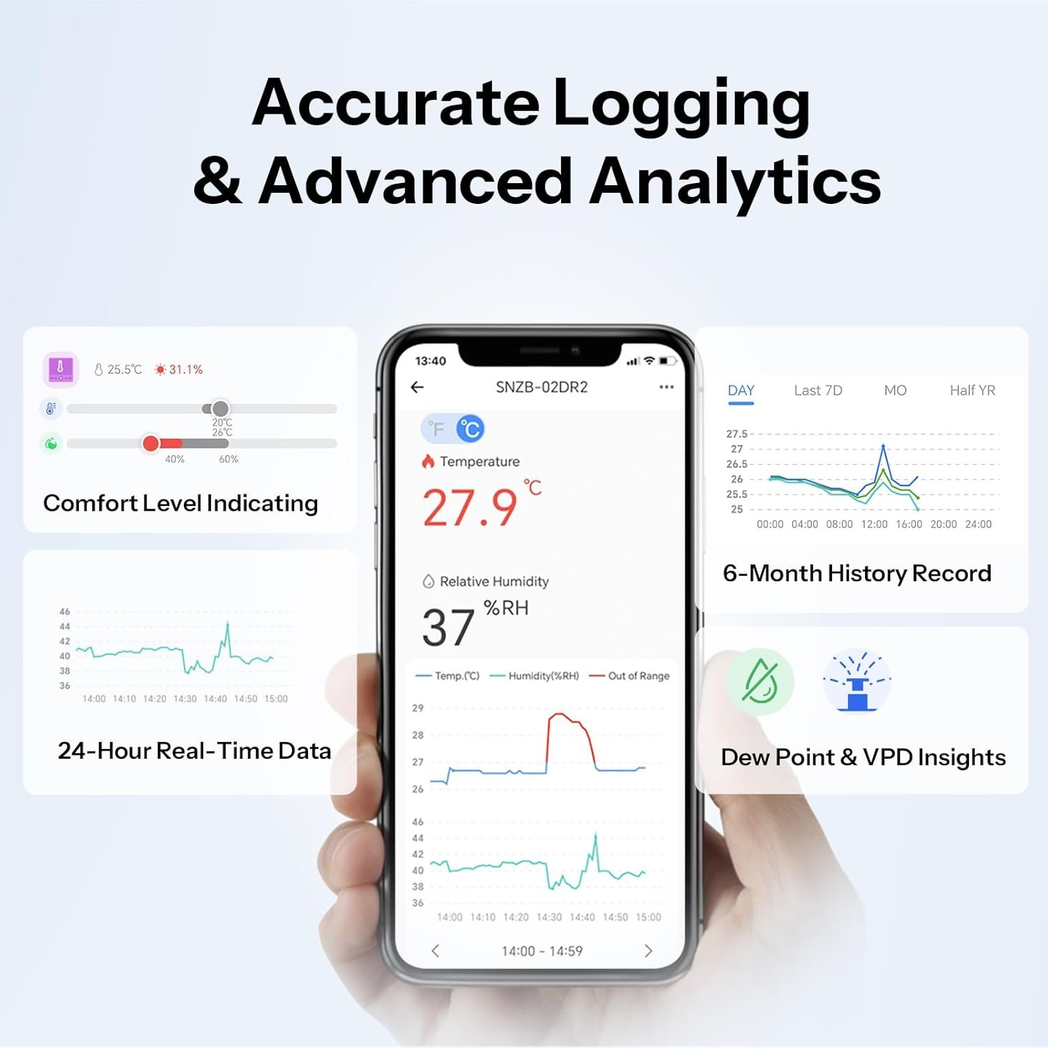 [Half-year History Record & Diverse Charts] View 6-month detailed records with maximum, minimum, and average curves across four time spans — daily, weekly, monthly, and half-year. The device also provides dew point and VPD insights. All history record can be exported for free.