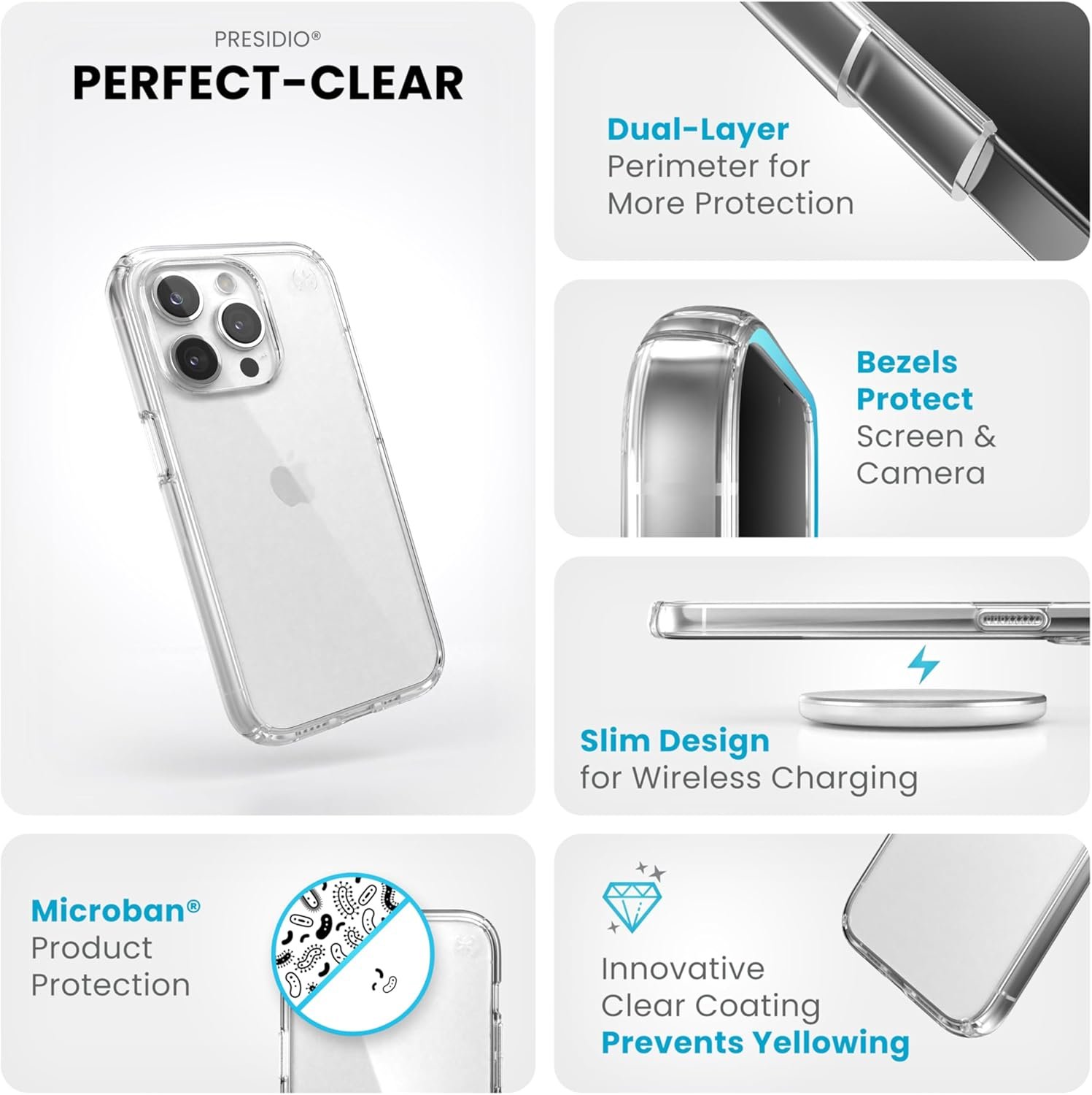 Hard case with Perfect-Clear coating to resist discoloration, scratching, and yellowing Hard case with Perfect-Clear coating to resist discoloration, scratching, and yellowing Premium soft-touch finish Premium soft-touch finish with durable inverted no-slip grips Premium soft-touch finish with durable inverted no-slip grips Hard case with Perfect-Clear coating to resist discoloration, no-slip grips, and embedded shimmer