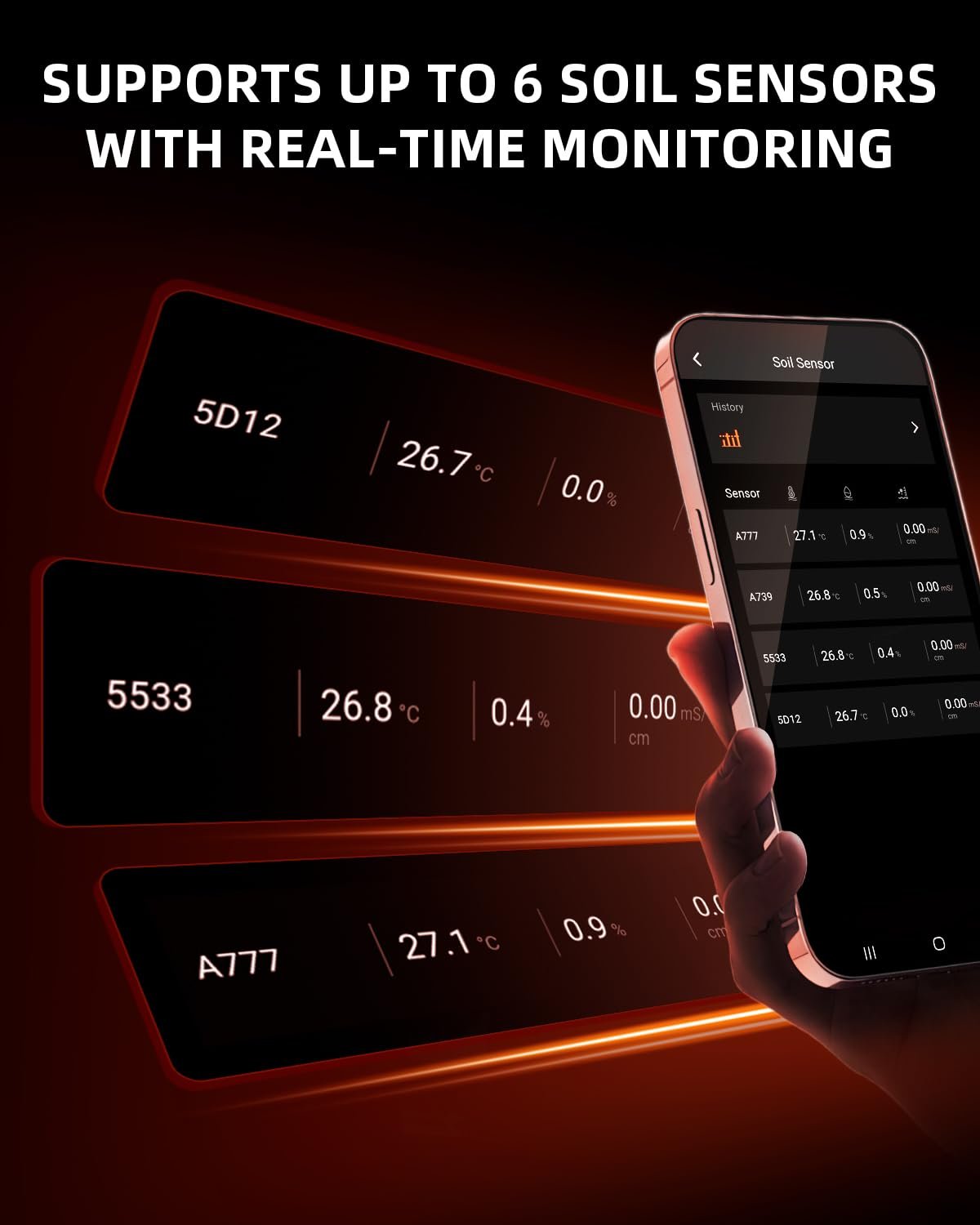Smart Connectivity & Multiple Control: The 3-in-1 Soil Sensor Pro supports multiple connections, with up to 6 soil sensors connectable to the same GGS system. It offers three substrate types for selection: yellow clay, peat soil, and coconut coir.