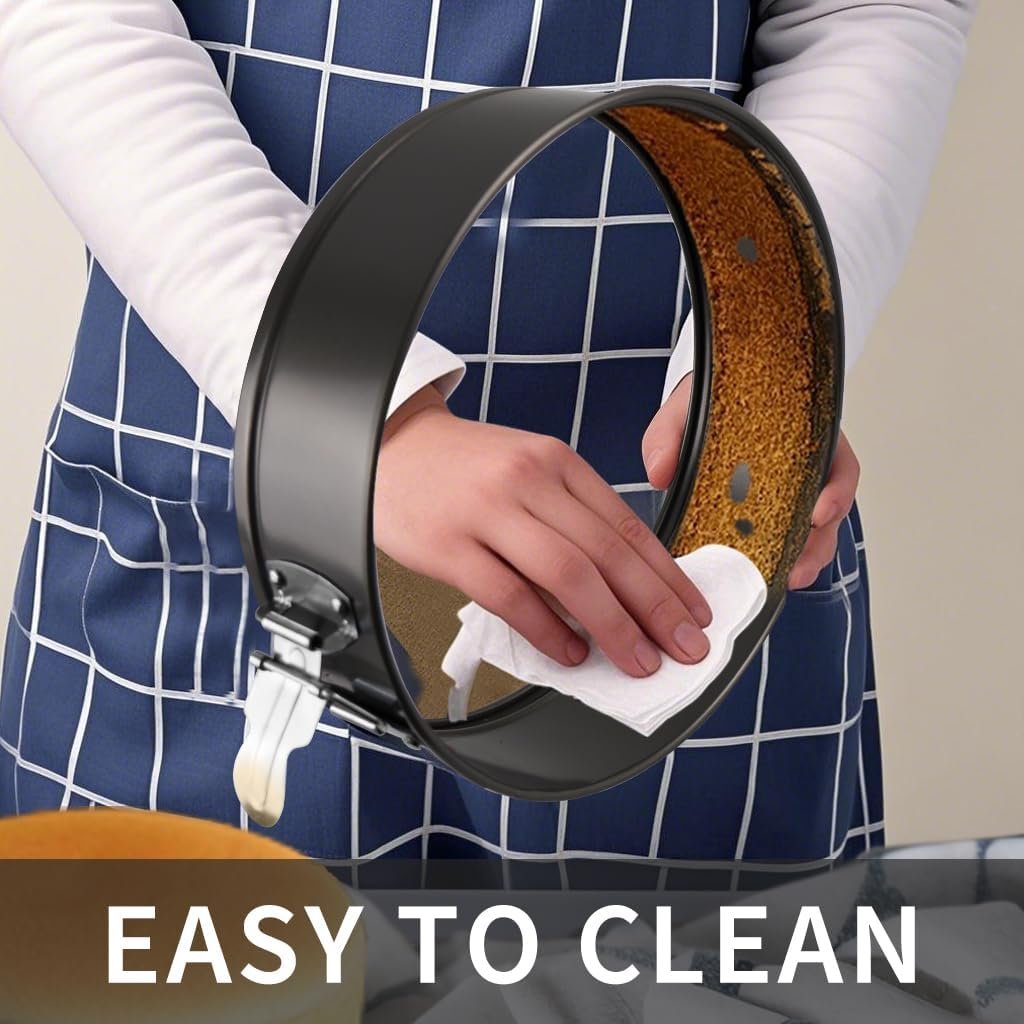 Cheesecake pans are made of double-layer carbon steel material (won’t rust). Spring form pan with food-grade non-stick coating for easy release when baking cake. And the spring latches are made of stainless steel, solid and not easy to break
