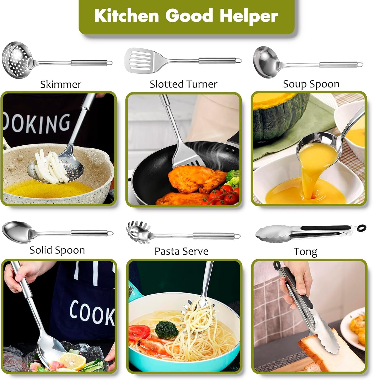 🍳【12 pcs Kitchen Utensils Set with Holder】Our cooking utensils set stainless steel is a economic set for cooking and baking. This kitchen utensils set contains total 12pcs different kitchen tools such as 1x slotted spoon, 1x solid spoon, 1x ladle, 1x slotted turner, 1x solid turner, 1x Fish Spatula, 1x skimmer, 1x Potato Masher, 1x whisk, 1x tongs, 1x Pasta Server. Besides, it also comes with a utensils holder to storage all tools.