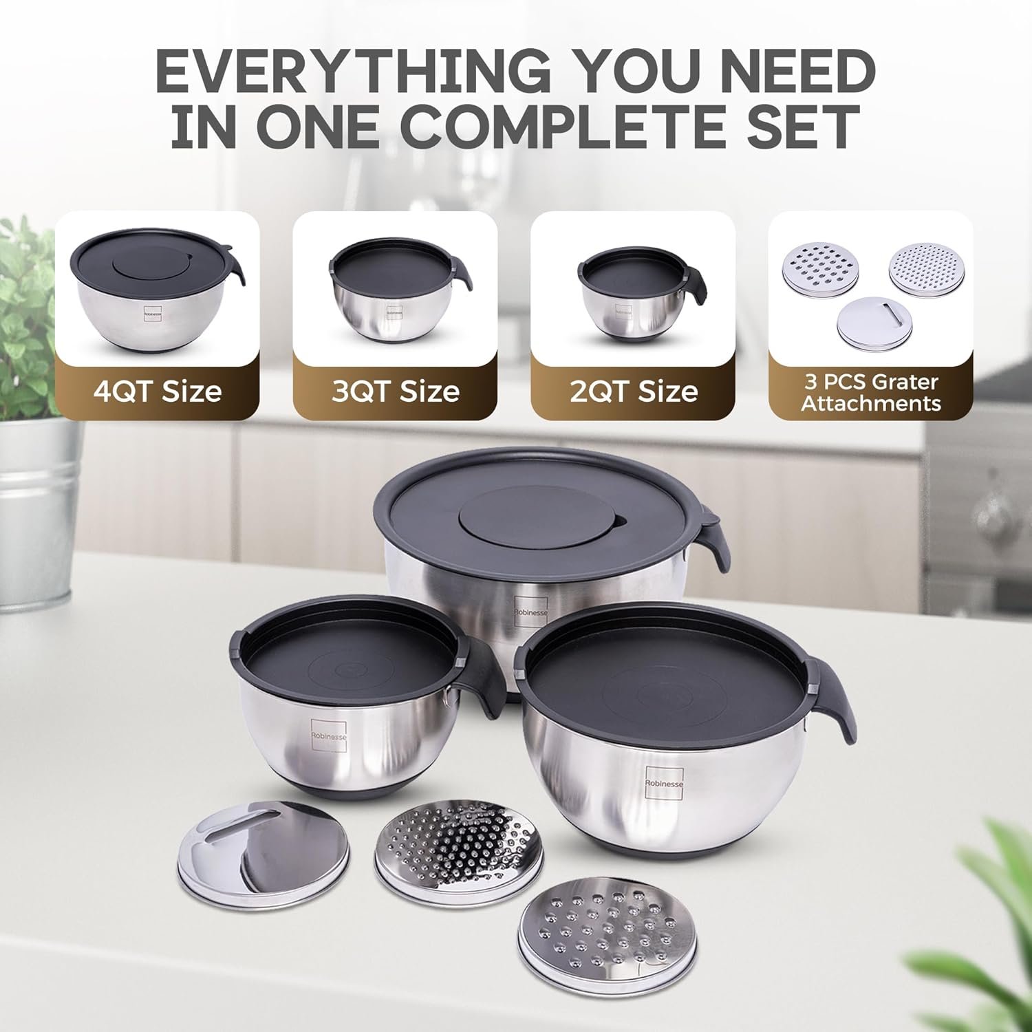 𝘼𝙞𝙧𝙩𝙞𝙜𝙝𝙩 𝙇𝙞𝙙𝙨 𝙒𝙞𝙩𝙝 3 𝙂𝙧𝙖𝙩𝙚𝙧 𝘼𝙩𝙩𝙖𝙘𝙝𝙢𝙚𝙣𝙩𝙨: Keep your ingredients fresh with leak-proof, airtight lids that lets you pour, blend, or add ingredients without mess. Includes 3 grater attachments (slicing, shredding, grating) that let you prep directly into the mixing bowl—perfect for meal prep and kitchen efficiency.