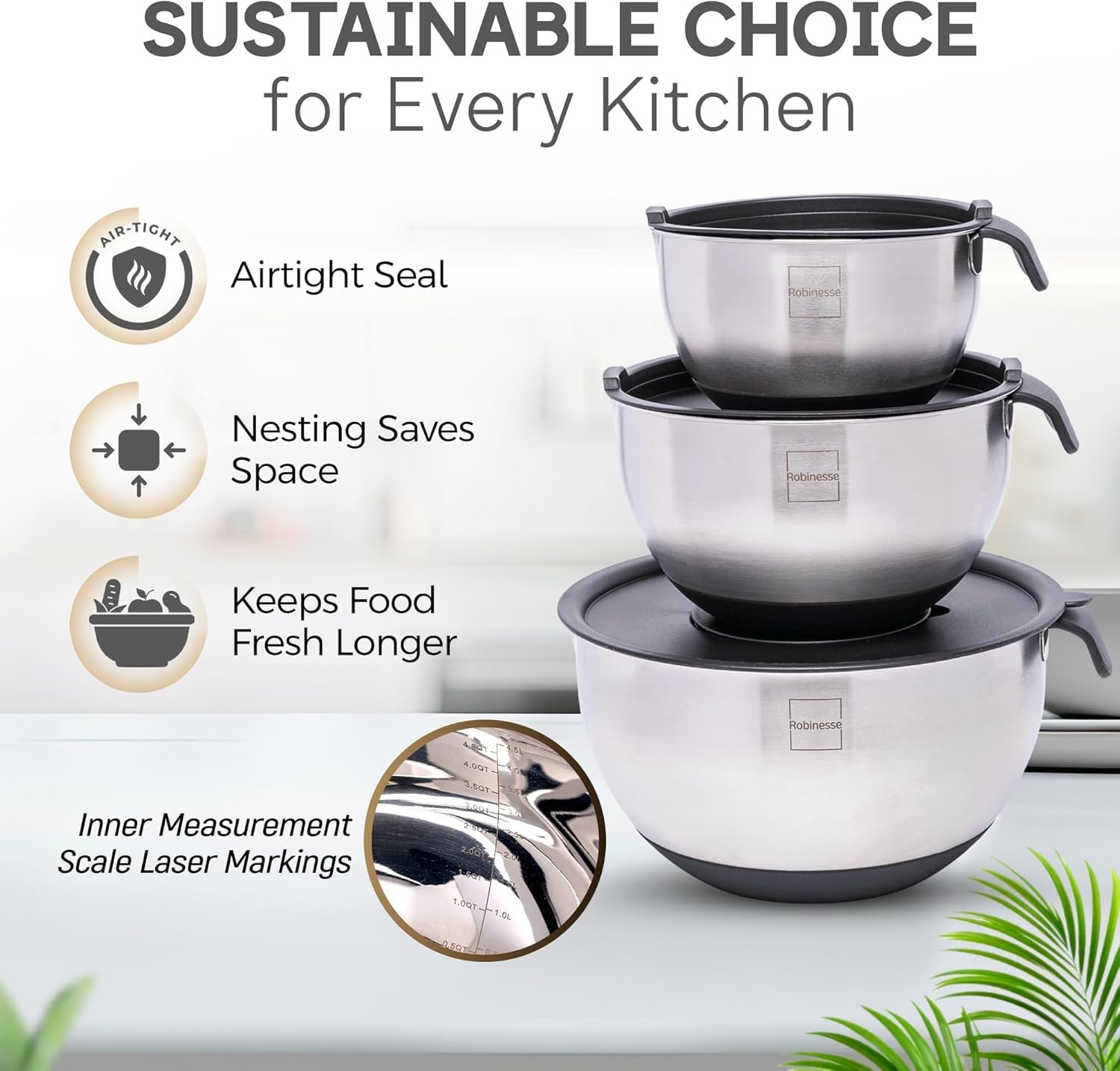 𝙋𝙧𝙚𝙢𝙞𝙪𝙢 & 𝙎𝙩𝙮𝙡𝙞𝙨𝙝 𝙎𝙩𝙖𝙞𝙣𝙡𝙚𝙨𝙨 𝙎𝙩𝙚𝙚𝙡 𝘽𝙤𝙬𝙡𝙨: These stainless steel mixing bowls are made to last. They won’t rust, stain, or hold odors, and they look great in any kitchen. Great for mixing, serving, or storing food. A durable and modern upgrade for everyday cooking, this versatile set includes 4QT, 3QT and 2QT bowls to handle all your kitchen tasks.