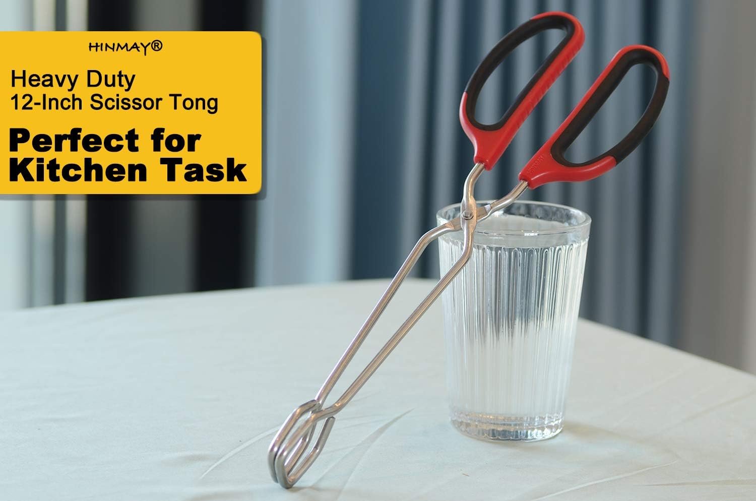 Brand: HINMAY Material: 18/8 (304) Stainless Steel + Black Silicone + Red Plastic Size: 12-Inch Weight: 4.10 OZ Package Included: 12-Inch Stainless Steel Scissor Tong × 2