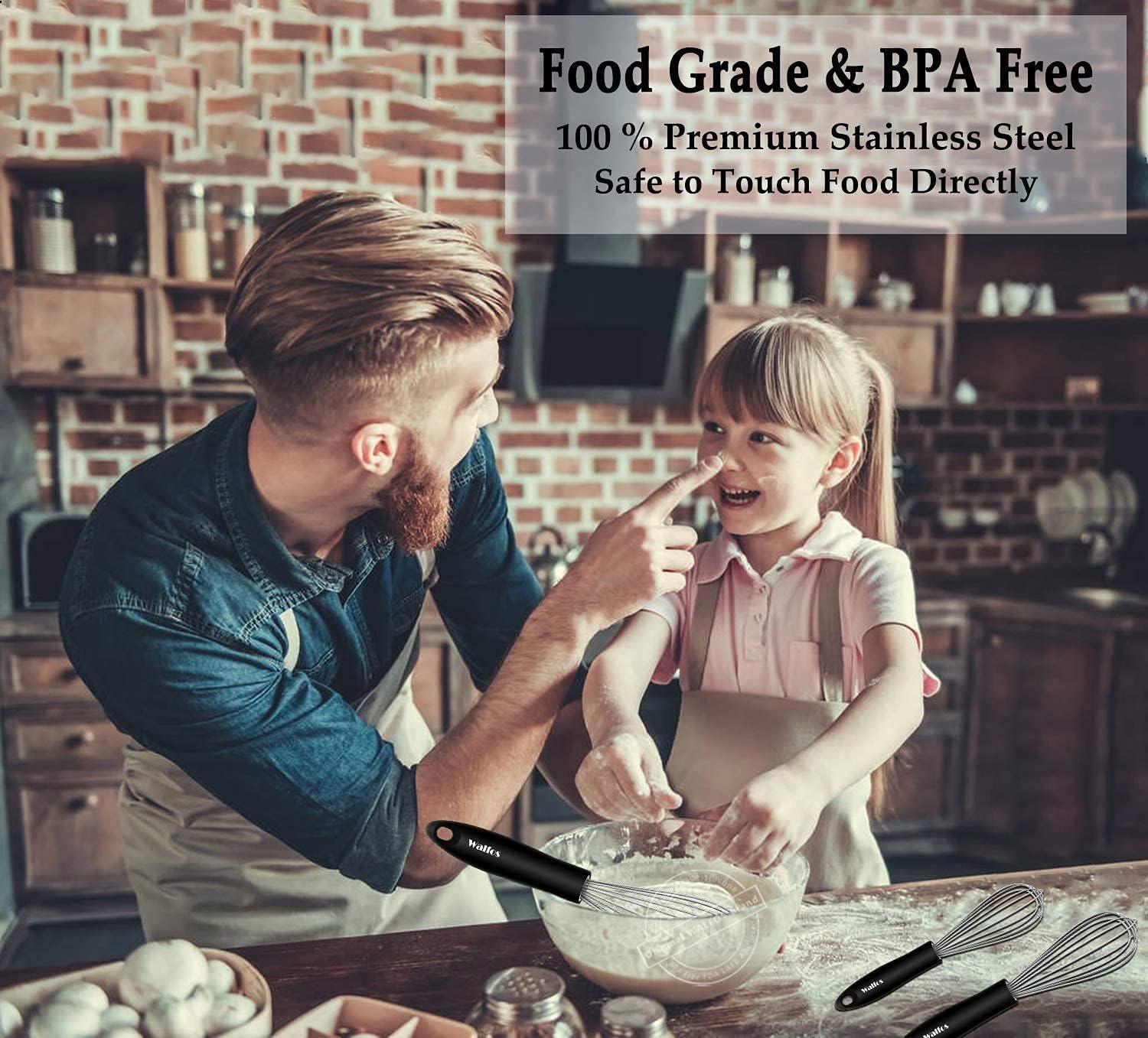 BETTER SEALED DESIGN & NOT SLIP HANDLE:Walfos whisks have better sealed with no place for water to get into the handle, keep you free from dirty dishwater, protect your food safety and good for your health. Comfortable and non-slip frosted handle design, provides better grip during whisking.