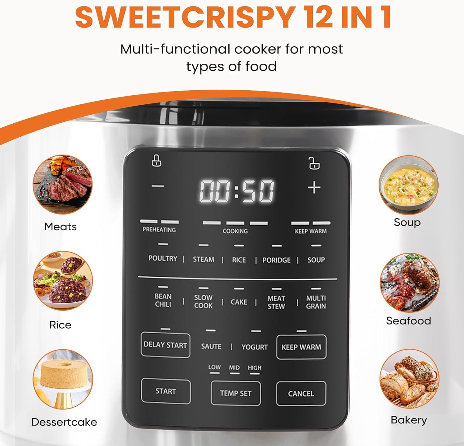 12-in-1 Versatile Cooking Options: Sweetcrispy electric cooker offers an array of cooking functions to suit your culinary needs, whether you’re slow cook, steam, yogurt, saute, meat/stew, cake, porridge, multigrain, rice, soup, bean/chili, poultry.