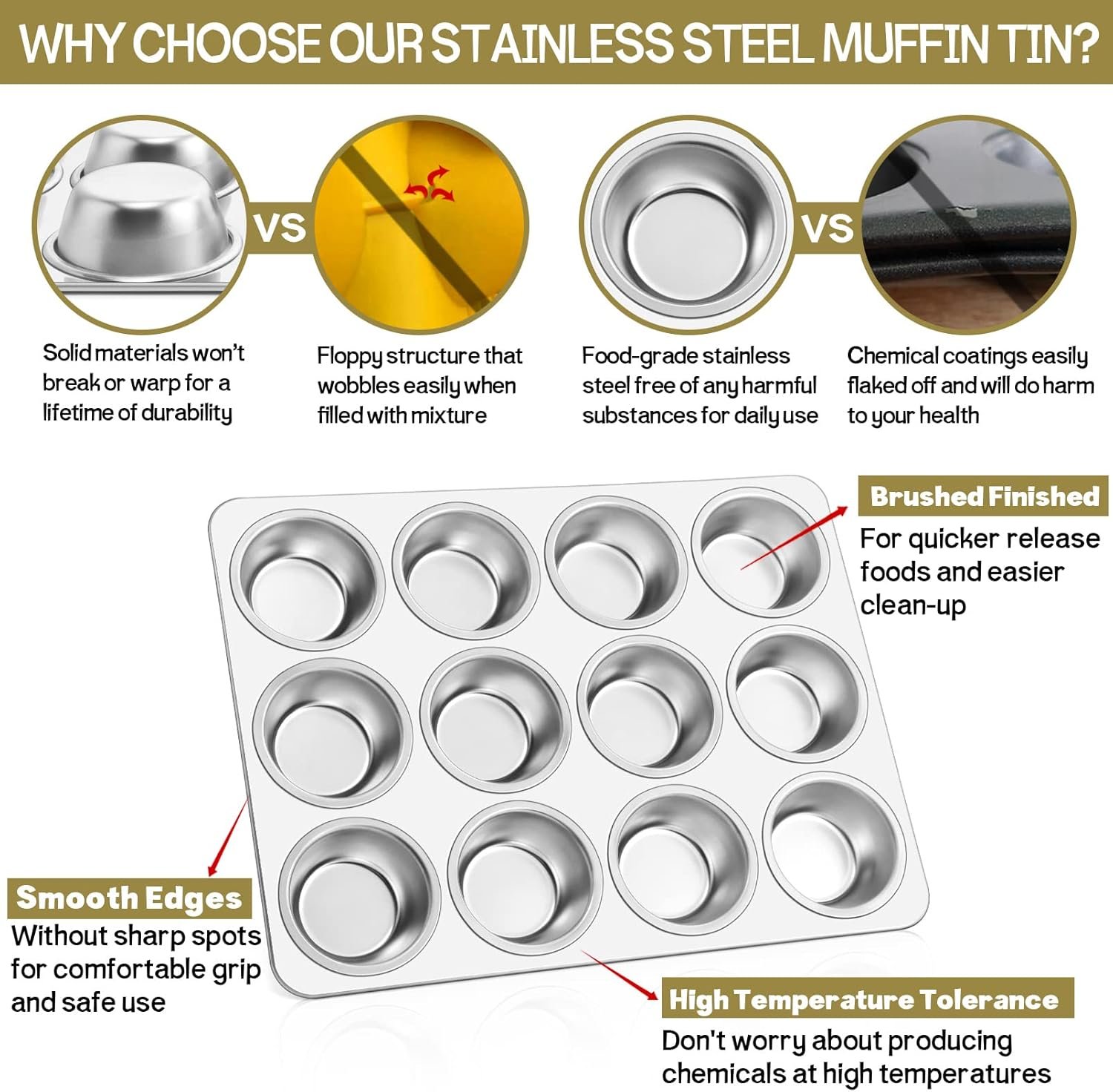 HEALTHY & STURDY MATERIAL – TeamFar 12-cup muffin pans, made of 18/0 stainless steel without any toxic coating peeling off into your food at heating, Great replacement of aluminum or coated pans, Healthier and safer for cooking, Premium steel with heavy gauge construction, Can be served for many years
