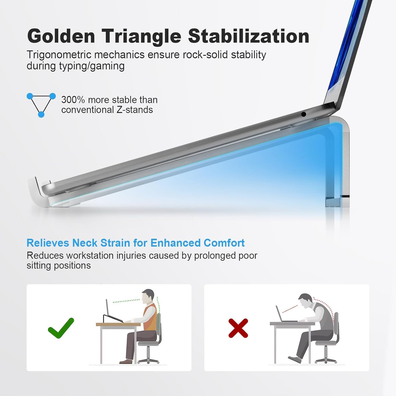 Wide Compatibility — This laptop riser is suitable for all laptops or tablets between 10 and 18 inches. Compatible with MacBook, ASUS, Acer, Notebook, Chromebook, HP, Dell and many more laptop models