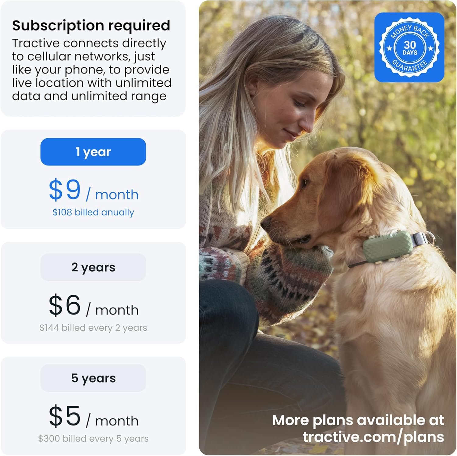 REAL-TIME GPS TRACKING WITH UNLIMITED RANGE: Track your dog with live location updates every 2–3 seconds. Unlike others that update once a minute, Tractive lets you follow every step with no distance limits, anywhere in the world.
