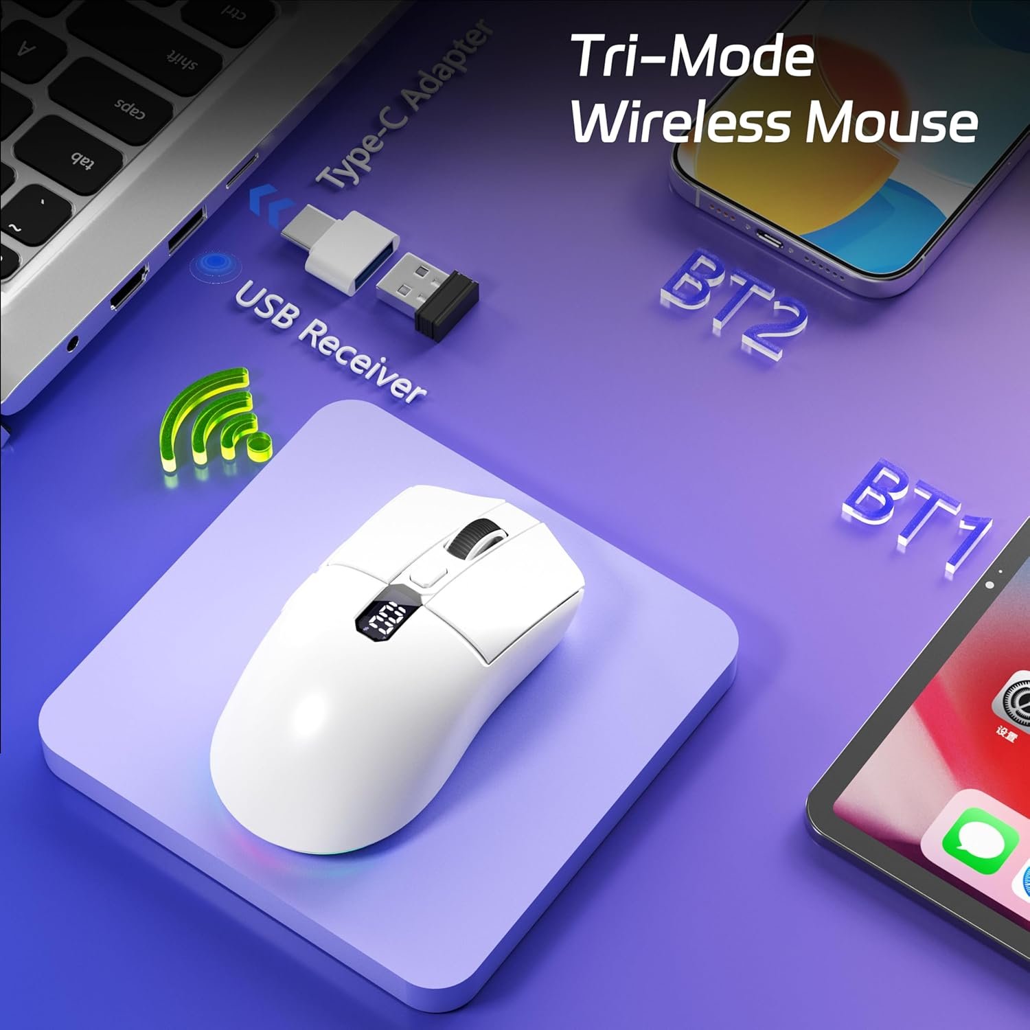 Uciefy Bluetooth Wireless Mouse, Tri-Mode (2.4G+BT5.0+BT5.1) LED Bluetooth Mouse, USB C Rechargeable with LED Screen Display, 2400 DPI Computer mice for Laptop/PC/Mac/iPad-White