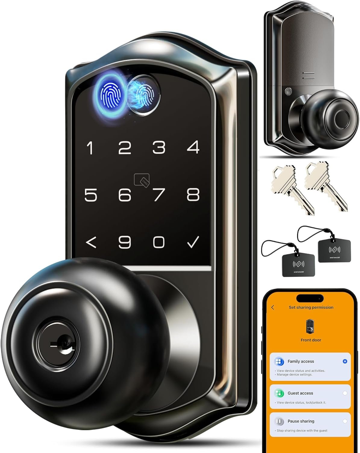 Veise VE018 Smart Knob Handle Lock – Fingerprint, App Control, Keyless Entry for Front Door and Bedroom, Electronic Digital Keypad, Auto Lock, Remote Access Sharing, IP55 Weatherproof, Matte Black