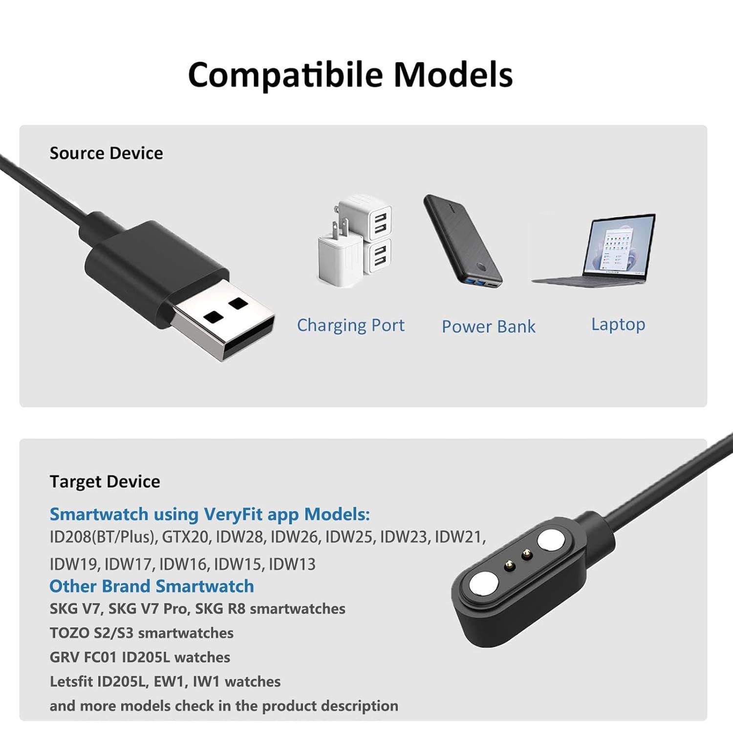 VeryFit Smartwatch Charger, Fit for ID208, GTX20, IDW13/15/16/17, IDW19/20/25/26/28 and More, Replacement Magnetic USB Cable for Fast and Easy Charging, 3.3 ft, (ID-Cable)