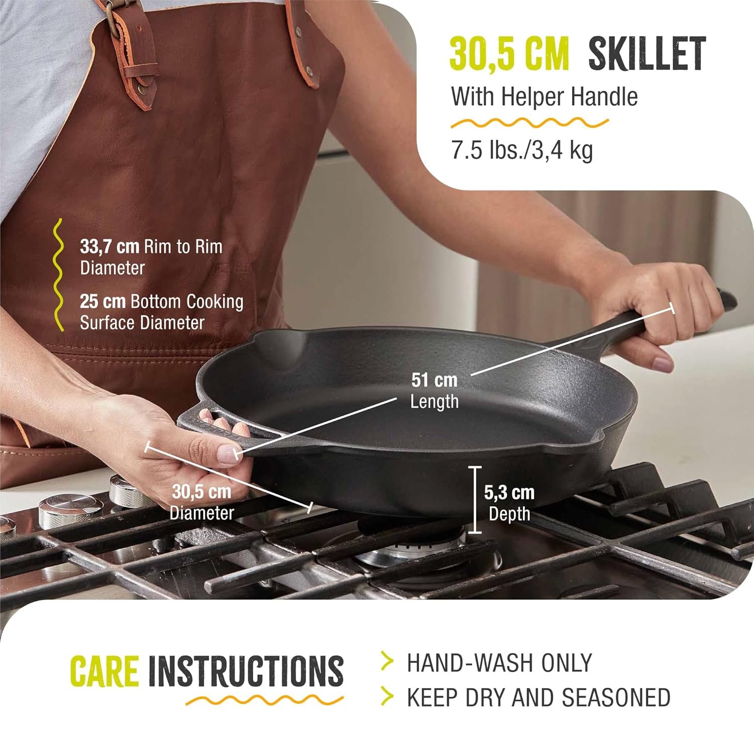 SPECIAL CARE: This cast iron pan is made with natural materials without synthetic coatings or processes. Our cookware requires special use and care and should never be air-dried or put in a dishwasher. Follow the included instructions for proper care.