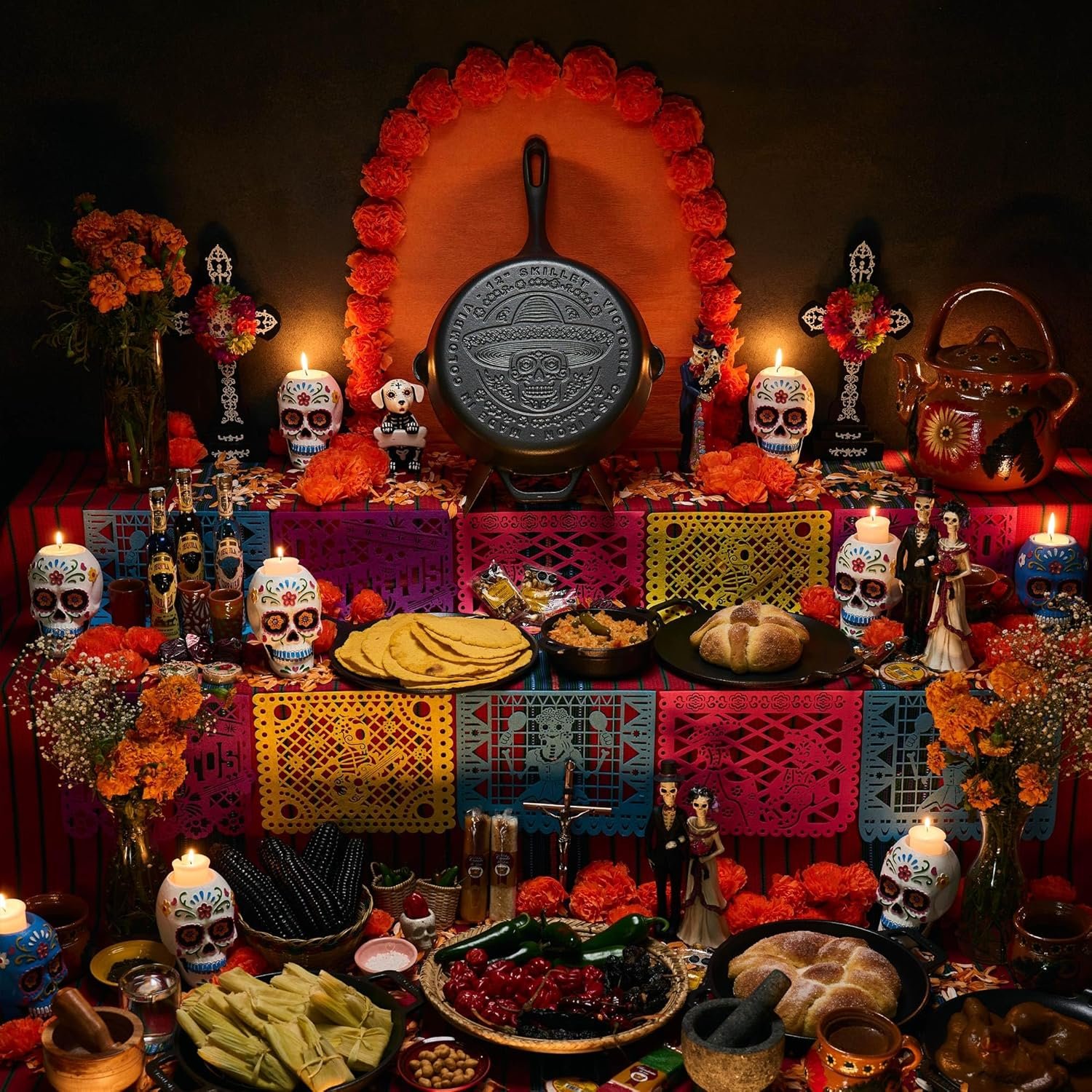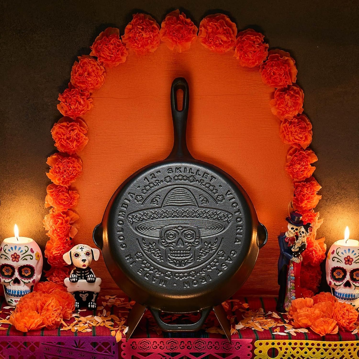 Victoria 12-Inch Day of the Dead La Calaca Cast Iron Skillet, Dia de los Muertos Seasoned Cast Iron Frying Pan with Long Handle, Made in Colombia