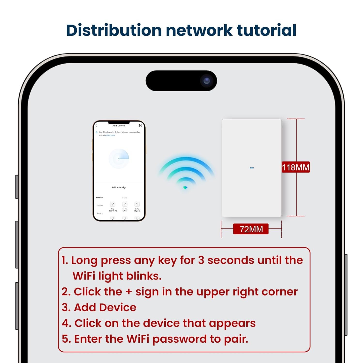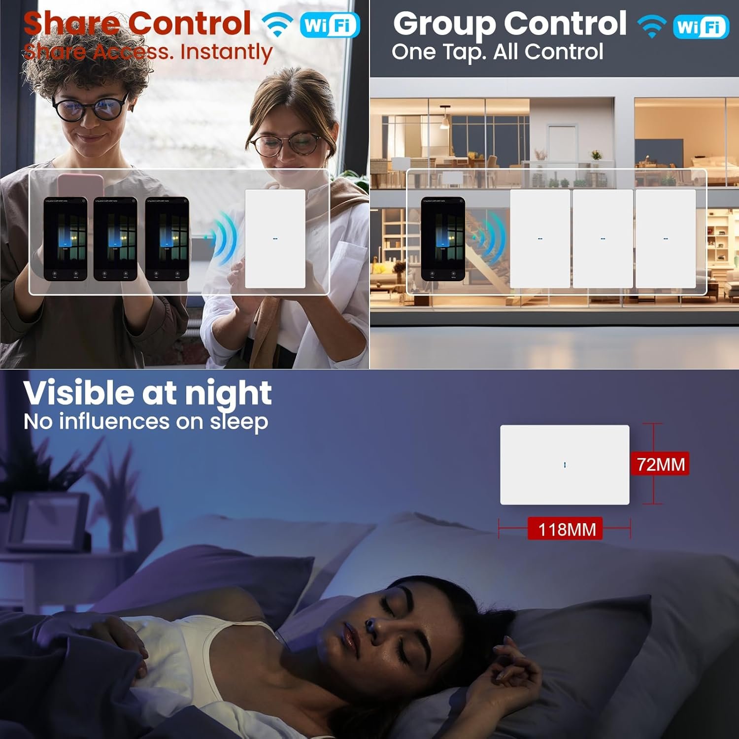 Full-Surface Push Button With Blue LED: The whole push button responds wherever you press and the soft blue LED indicator helps you find the WiFi light switch in the dark without feeling too bright
