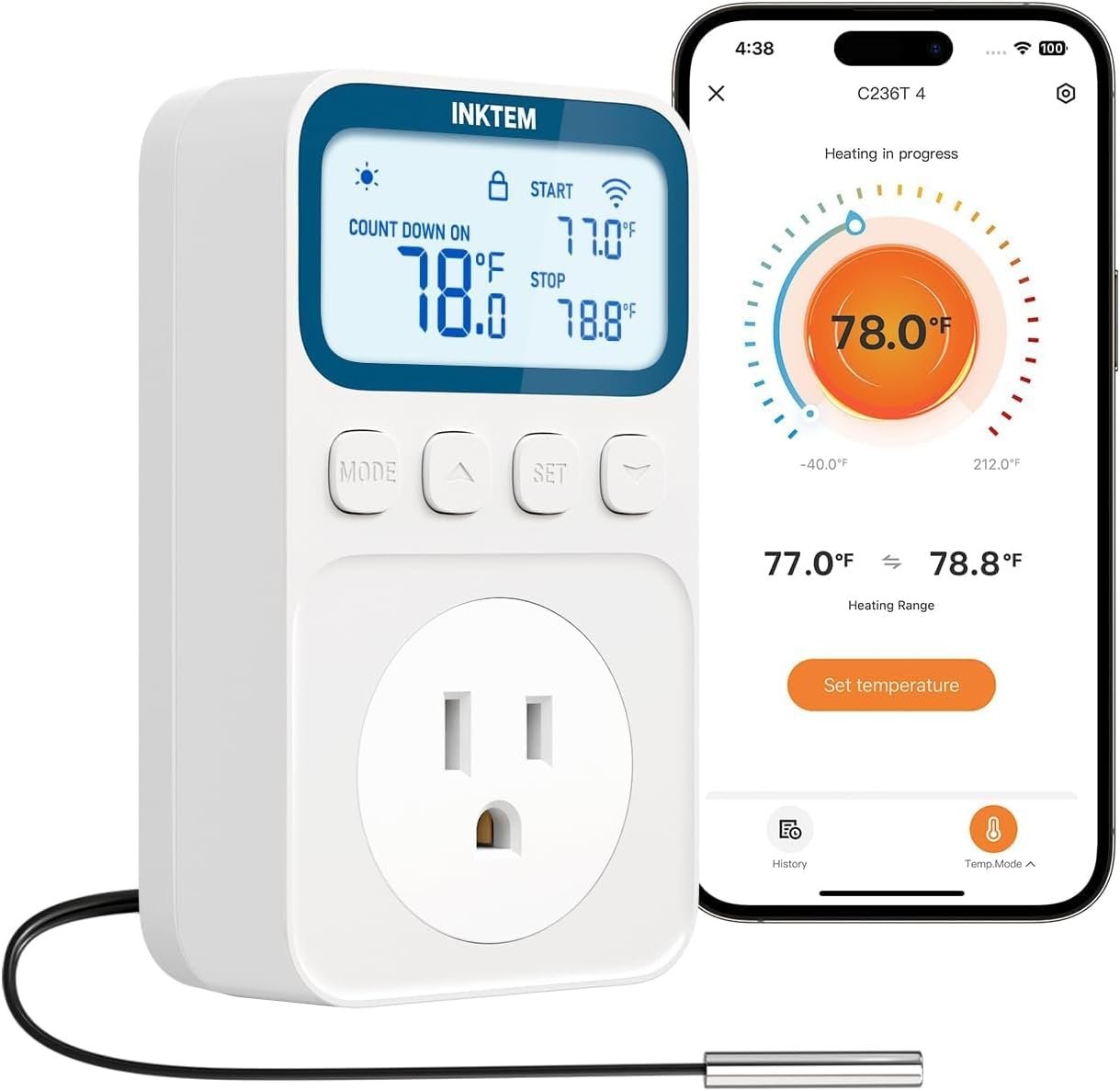 WiFi Temperature Controlled Outlet, Plug in Thermostat Outlet for Space Heater, Duration Timer & Smart Memory Digital Temp Controller, -40℉~212℉, IP67 Waterproof Probe for Incubator, Reptile